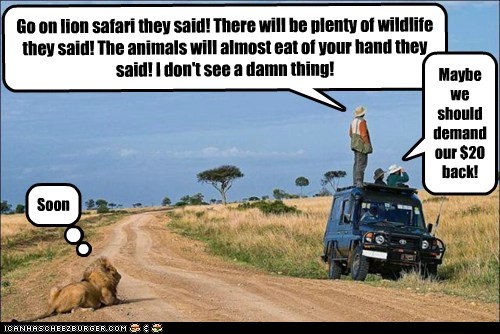 "Go on lion safari, they said! There will be plenty of wildlife, they said! The animals will almost eat off your hand, they said! I don't see a damn thing!" "Maybe we should demand our $20 back!" "Soon"