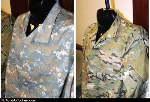 Stars and Stripes reports that the U.S. military is recalling its pixelated grey-khaki camouflage uniforms that have been used in the Middle East since 2004. Apparently, soldiers had been complaining since 2009 that the Universal Camouflage Pattern (left) left them more conspicuous than covered. The troops are now being outfitted with more traditional greenish MultiCam duds (right) while the government tests out the effectiveness of new patterns.