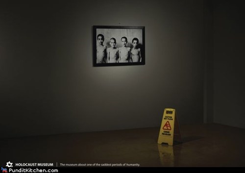 A "Caution Wet Floor" sign in the Holocaust Museum in Argentina. Using sadness as your selling point by using a cheap visual joke! Not in bad taste at all whatsoever, carry on.