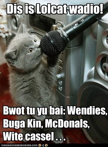 Dis is lolcat wadio! Bwot tu yu bai: Wendies, Buga Kin, McDonals, Wite Cassel...