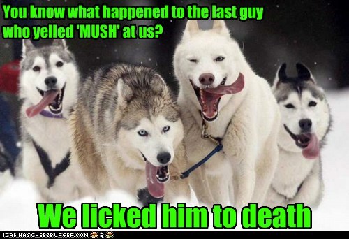 You know what happened to the last guy who yelled 'MUSH' at us? We licked him to death!