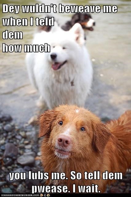 Dey wuldn't beweave me when I teld dem how much you lubs me. So tell dem pwease. I wait.