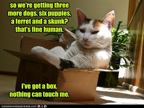 So we're getting three more dogs, six puppies, a ferret and a skunk? That's fine human. i've got a box. nothing can touch me.