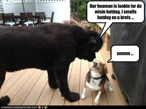 Our hooman is lookin for da misin hotdog. I smells hotdog on u brefs ...