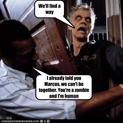 We'll find a way. I already told you Marcus, we can't be together. You're a zombie and I'm human. -Night of the Living Dead? (idk :/)