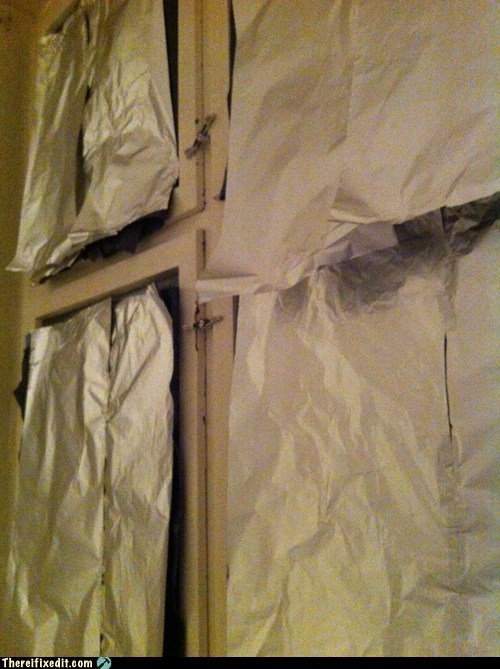 "With my wife wanting to pick out curtains for our apartment and me getting tired of being woken up by the sun every morning I figured "curtains" consisting of trash bags and aluminum foil would help move her along to making a proper selection. Also doubles as a way to discourage guests as she doesn't want anyone seeing this hack job."