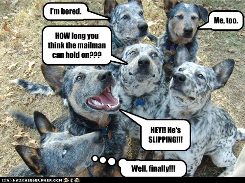 I'm bored. Me too. HOW long you think the mailman can hold on??? Hey!! He's SLIPPING!!! Well, finally!!!