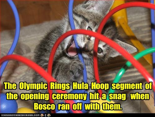 The Olympics Rings Hula Hoop segment of the opening ceremony hit a snag when Bosco ran off with them.
