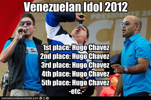 Venezuelan Idol 2012 1st place: Hugo Chavez 2nd place: Hugo Chavez 3rd place: Hugo Chavez 4th place: Hugo Chavez 5th place: Hugo Chavez -etc.-