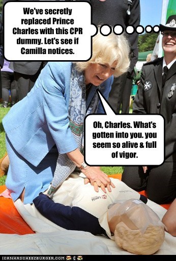 We've secretly replaces Prince Charles with this CPR dummy. Let's see if Camilla notices Oh, Charles. What's gotten into you. You seem so alive and full of vigor.