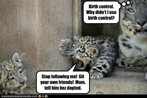 "Stop following me! Git your own friends! Mom, tell him hez dopted." Birth control. Why didn't I use birth control?