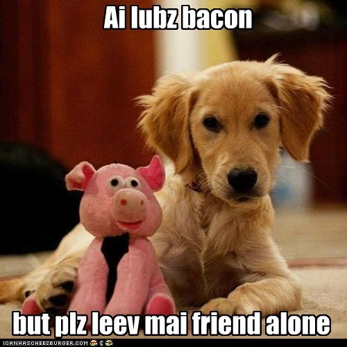 Ai lubz bacon but plz leev mai friend alone. meybe ur friend kan help u getz teh bakon!