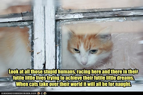 Look at all those stupid humans, racing here and there in their futile little lives trying to achieve their futile little dreams. When cats take over their world it will all be for naught. Da onlee thing mightier dan owr ambition is owr egoes.