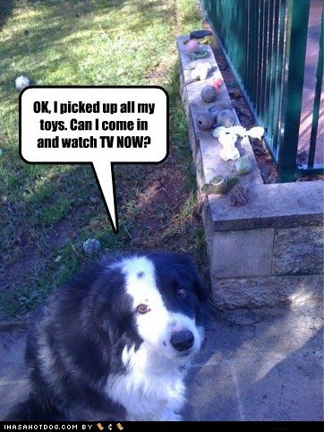 OK, I picked up all my toys. Can I come in and watch TV NOW? kan ai getz a toy karriur?