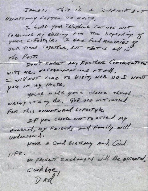 In August of 2007, I finally built up the courage to tell my father I was gay. The moment I said it, the phone got quiet and he got off the phone after a few "Okay"s. I decided to give him time to process the news. About a week later, and not long before my birthday, I received the following letter: "James: This is a difficult but necessary letter to write. I hope your telephone call was not to receive my blessing for the degrading of your lifestyle. I have fond memories of our times together, but that is all in the past. Don't expect any further conversations With me. No communications at all. I will not come to visit, nor do I want you in my house. You've made your choice though Wrong it may be. God did not intend for this unnatural lifestyle. If you choose not to attend my funeral, my friends and family will understand. Have a good birthday and good life. No present exchanges will be accepted. Goodbye, Dad." ... 5 years on and I am still doing fine, though this letter saunters into my mind every once in a while. When it does, I say without hesitation: F**k you, Dad.