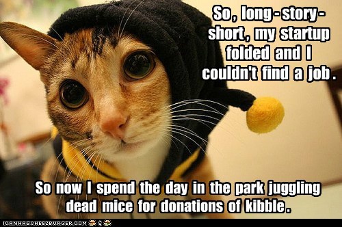 So, long-story-short, my startup folded and I couldn't find a job. So now I spend the day in the park juggling dead mice for donations of kibble.