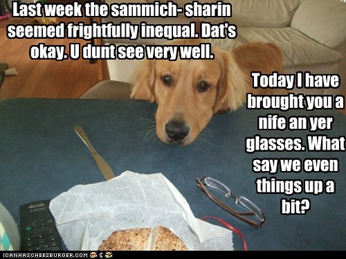 Last week the sammich-sharin seemed frightfully inequal. Dat's okay. U dunt see very well. Today I have brought you a nife an yer glasses. What say we even things up a bit?
