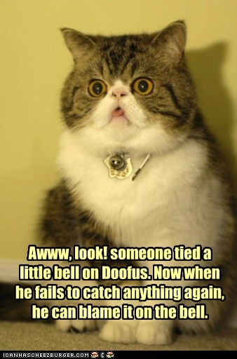 Awww, look! someone tied a little bell on Doofus. Now when he fails to catch anything again, he can blame it on the bell. He's gawt it where it cownts, tho.