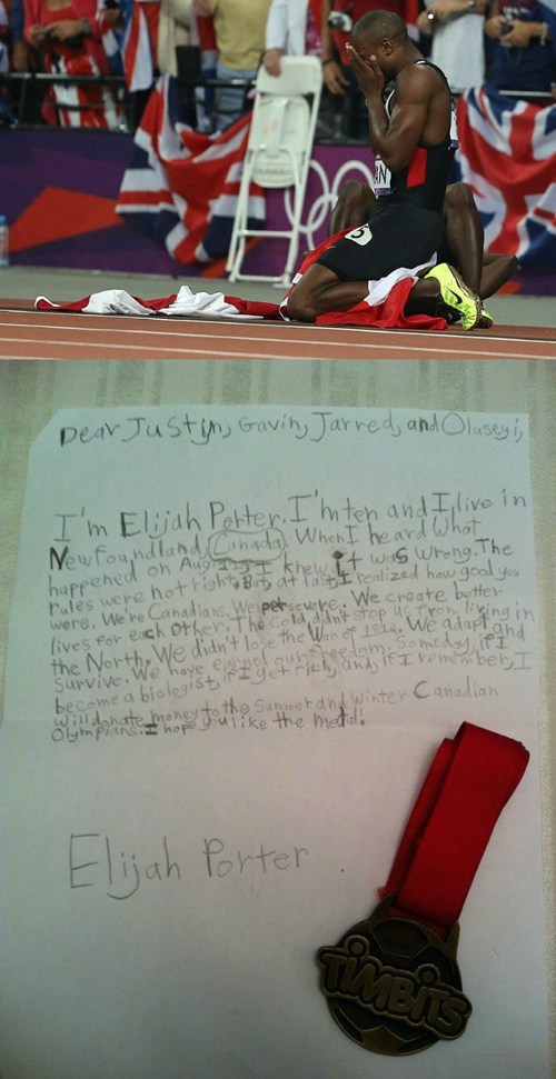 Dear Justyn, Gavin, Jarred [sic], and Oluseyi, I'm Elijah Porter. I'm ten and I live in Newfoundland, Canada. When I heard what happened on Aug. 11, I knew it was wrong. The rules were not right. But, at last, I realized how good you were. We're Canadians. We persevere. We create better lives for each other. The cold didn't stop us from living in the north. We didn't lose the War of 1812. We adapt and survive. We have earned our freedom. Someday, if I become a biologist, if I get rich, and, if I remember, I will donate money to the summer and winter Canadian Olympians. I hope you like the medal! Elijah PorterElijah included with the letter his medal from a soccer clinic sponsored by Tim Hortons. [deadspin]