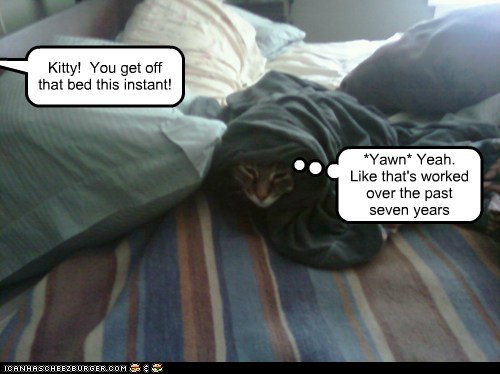 Kitty! You get off the bed this instant! *Yawn* Yeah. Like that's worked over the past seven years.