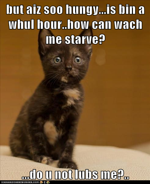but aiz soo hungy...is bin a whul hour..how can wach me starve? ...do u not lubs me?.. FINE. GO ON WIBOUT ME.