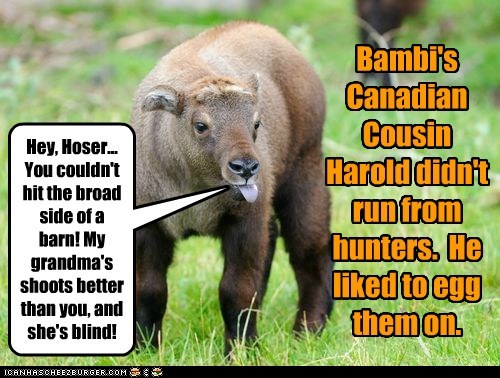 "Hey, hoser... you couldn't hit the broad side of a barn! My grandma shoots better than you, and she's blind!" Bambi's Canadian cousin Harold didn't run from hunters. He liked to egg them on.