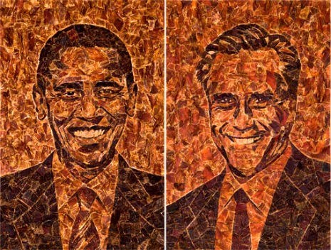 Introducing Barack Obameat and Meat Romney. Only took San Francisco mosaic artist Jason Mercier 50 hours to complete. Don't miss the making-of vid. [dangerousminds]