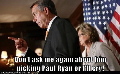 Don't ask me again about him picking Paul Ryan or I'll cry! (John Boehner)