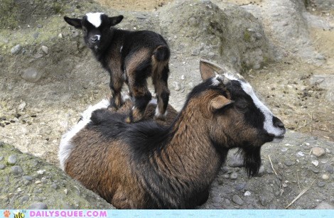 That is one patient and mellow goat parent. Or maybe it's just too tired out from taking care of its squeedorable, energetic kids all day? Either way I suspect we have a rebel on our hands here.