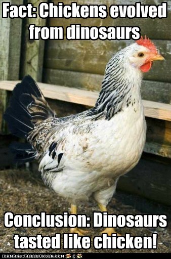 Fact: Chickens evolved from dinosaurs Conclusion: Dinosaurs tasted like chicken!