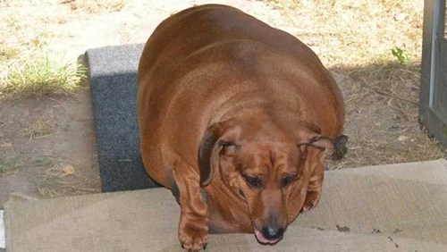 Poor lil obese Obie. The 5-year-old dachsund's elderly owners loved him nearly to death by doting on him with food.