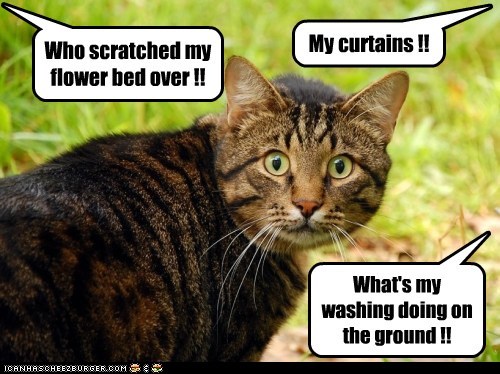 Who scratched my flower bed over!! My curtains!! What's my washing doing on the ground!! Sumwun cud use sum cat shaming.