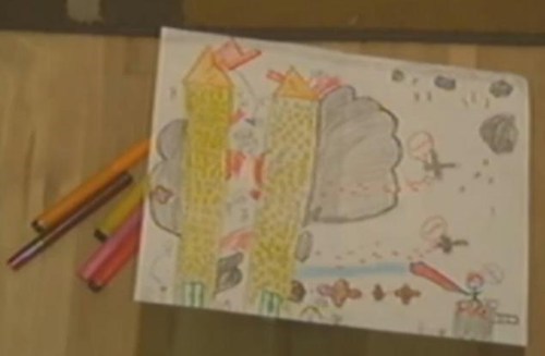 The drawings depict stick figures falling from the burning buildings with speech bubbles that read "help" and "I love you."