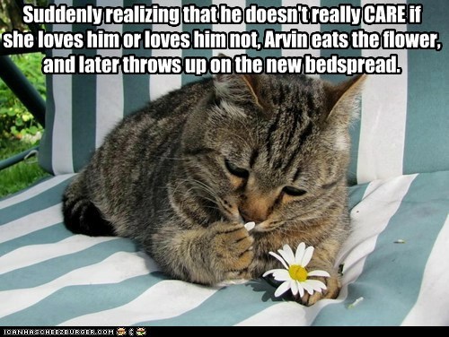 Suddenly realizing that he doesn't really CARE if she loves him or loves him not, Arvin eats the flower, and later throws up on the new bedspread.