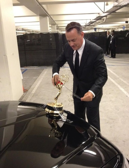 At this year's Emmy Awards, won the Emmy for Outstanding Miniseries or TV Movie for his work as a producer on political drama "Game Change." Not to be deterred by all the Rolls-Royce drivers out there, Hanks decided to pimp out his ride by making his Emmy the hood ornament on his Lincoln... with masking tape. Xzibit and the guys at West Coast Customs would be proud!