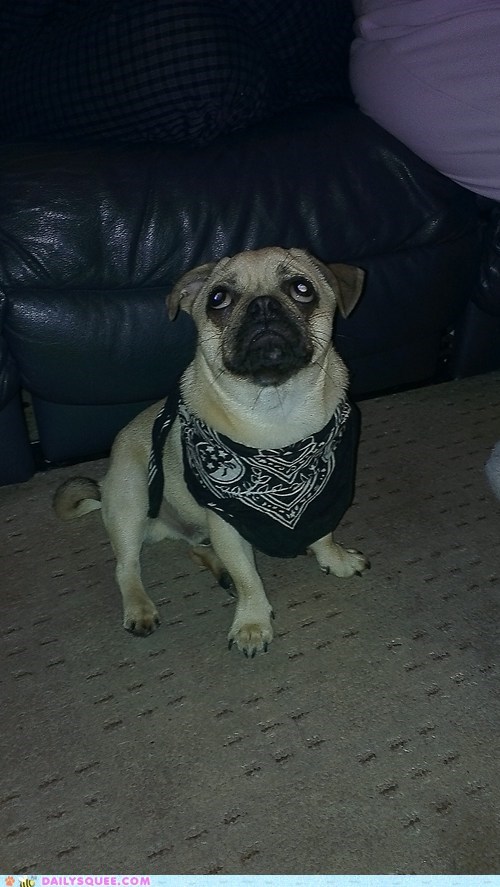 Kat says:"My little Puggy Mab, playing as a cowboy, seems to like posing in his new bandana!"