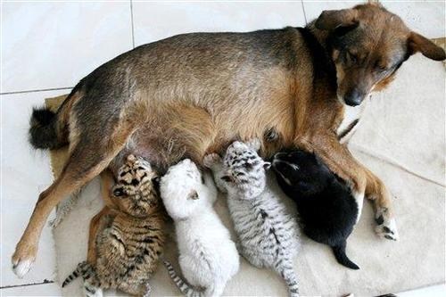 "Love is blind" and this dog does not care one bit what species these babies-in-need are. They might be tiger cubs, not puppies, but she is going to love them all the same!