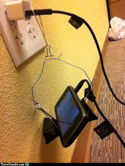 "I needed to plug my phone into the wall, but it's right behind where my chair is, and I didn't want to roll over it. So whats the solution? Office supplies!"