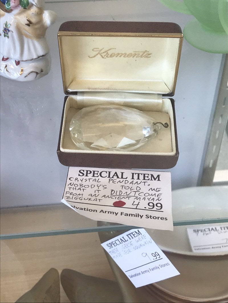 “Crystal pendant. Nobody’s told me that it didn’t come from an ancient Mayan ziggurat”