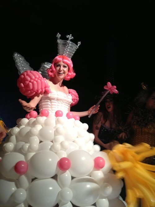 Seattle local radio celeb, Rachel Belle models an incredible balloon sculpture creation made by artist Steven Jones.