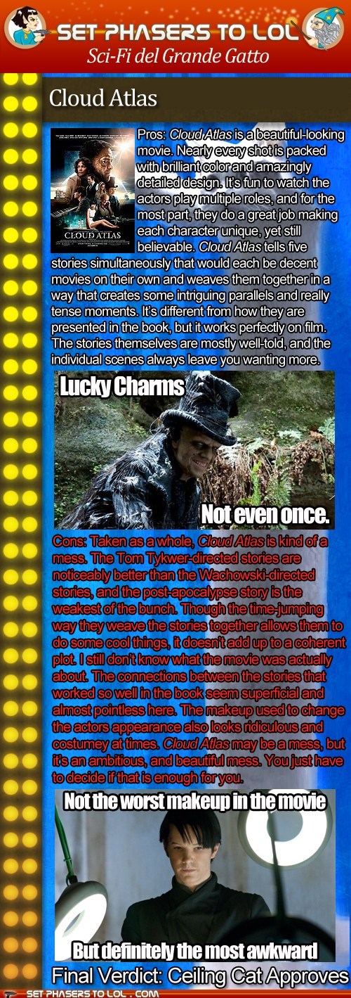 This is a hard movie to recommend. For me, the good outweighed the not-so-good, and I ended up enjoying the movie a lot. Many people don't feel that way, and it's easy to see why. If you go see Cloud Atlas this weekend, please come back here and tell us what you think. This is one of those movies where it helps to get as many opinions together as possible.
