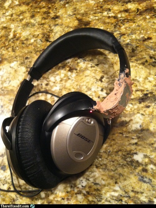 Crude and cheap Bondo and sheet metal repair for an expensive set of head phones.