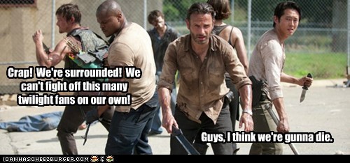 Crap! We're surrounded! We can't fight off this many twilight fans on our own!