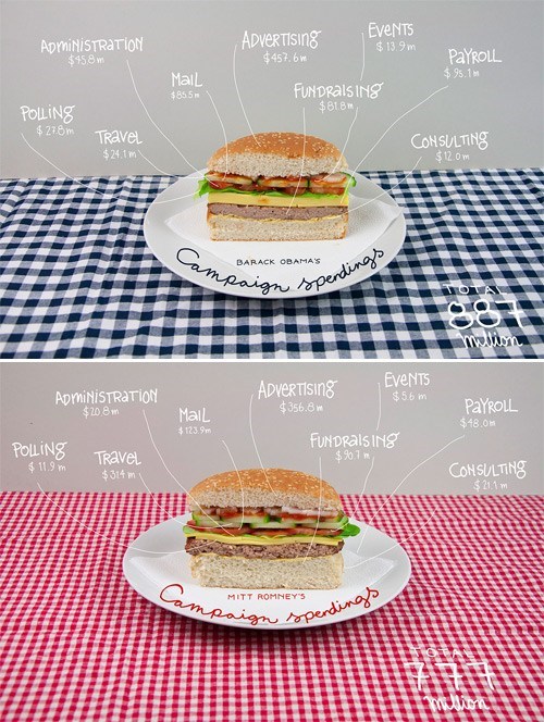 Check out "Binders Full of Burgers," a delicious collection of fast food-themed infographic charts visualizing the stats behind the 2012 U.S. presidential campaigns, such as this comparison of Obama and Romney's campaign spendings (shown left). Created by German artists Lisa Rienermann and Anna Lena schiller who also worked on a similar project for the 2011 Berlin state election with waffles and fruits.