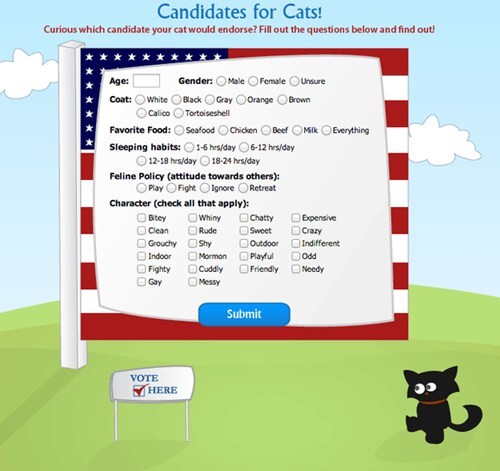 Finally, you can answer the age-old question: Who would my cat vote for? Click the image to the left, enter in the required information about your kitteh, and see if you cat would vote for Mitt Romney or Barack Obama. FOR AMERICA!