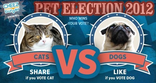 DECISION DAY IS HERE, CHEEZFRENDS! Cast your vote: cats vs. dogs. WHO WILL WIN? YOU DECIDE! Visit Cheezburger's Facebook page to vote for your choice. America will never be the same...
