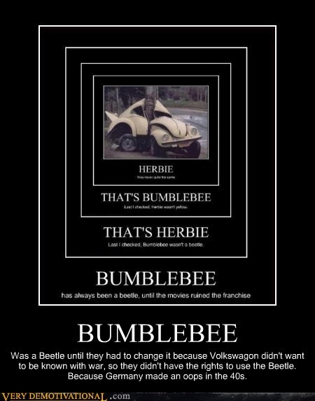 BUMBLEBEE was a beetle until they had to change it, because Volkswagon didn't want to be war, so they didn't have the rights to use the beetle. Because Germany made an oops in the 40s