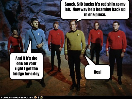 Spock, $10 bucks it's red shirt to my left. Now way he's beaming back up in one piece.