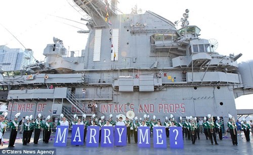 Surprise proposal aboard the USS Intrepid Manhattan. Thanks, high school marching band!