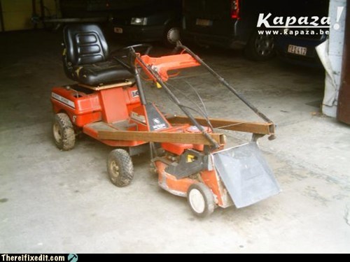 Want all the comfort of a tractor mower without any of the precision? Then buy Frankenmower! Dandelions beware! It also doubles as a snow plow. Bonus!